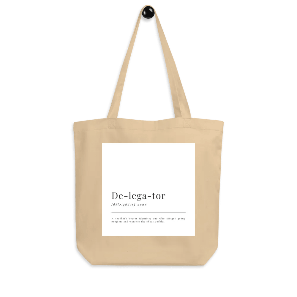 The "De-lega-tor" design humorously captures the essence of a teacher's alter ego, bringing a smile to anyone who has ever been on either side of a group project. With its spacious and sturdy construction, this tote is ideal for carrying everything from lesson plans and notebooks to groceries and gym gear, making it as practical as it is entertaining.