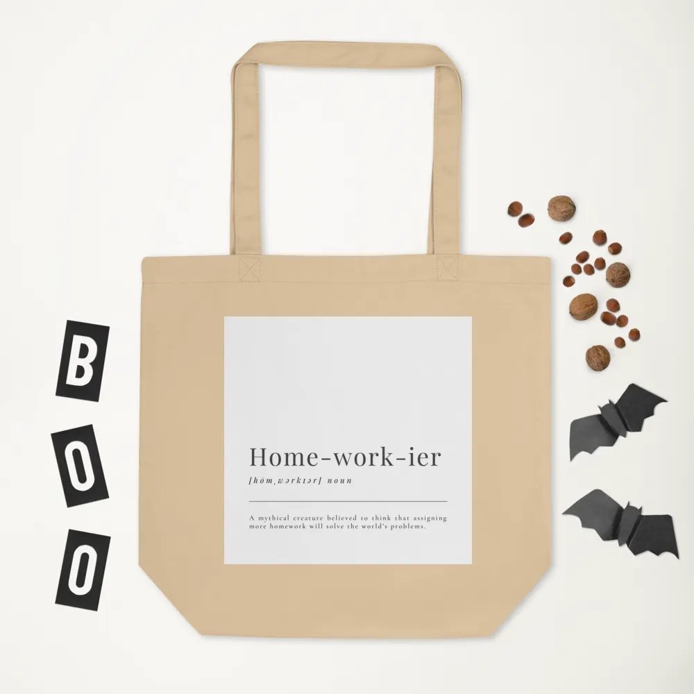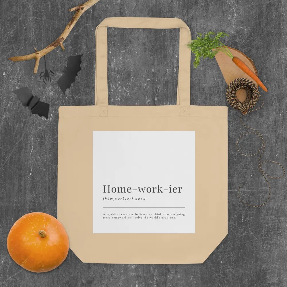 Featuring the witty "Home-work-ier" design, this tote defines the term with a touch of sarcasm, making it a great conversation starter wherever you go. Whether you're hauling textbooks, notebooks, or your daily essentials, this bag is as practical as it is playful. The spacious interior and sturdy construction ensure it can handle the demands of daily use while still being gentle on the planet.